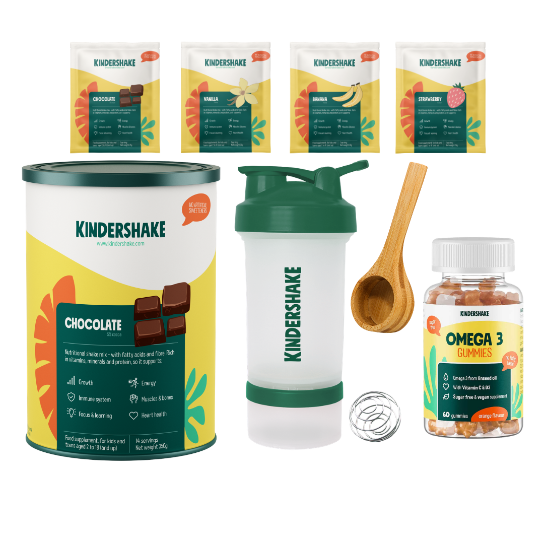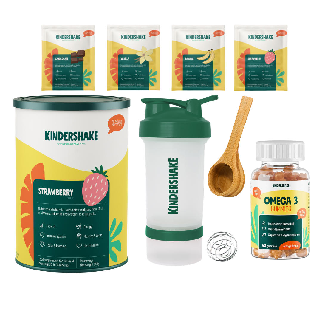 Kindershake vanille (14 porties), omega 3 gummies, shakebeker, bamboe maatschep, 4 zakjes Kindershake